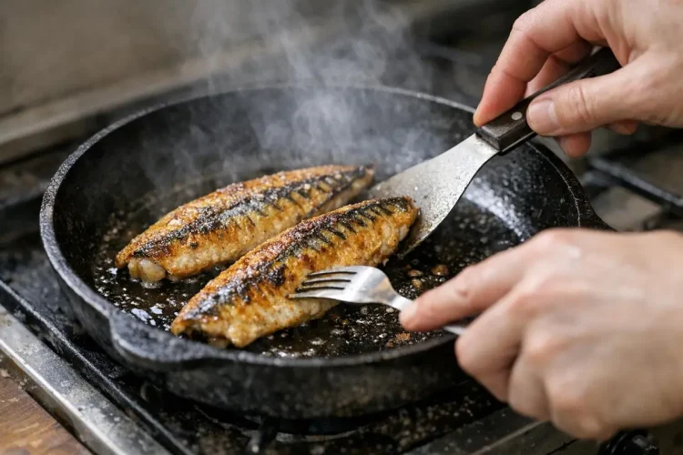 Le secret ? Poêle chaude, filets bien secs, manipulations réduites. Comptez deux à trois minutes de préchauffe à feu moyen-vif, puis versez l’huile. Le maquereau contient déjà une belle part de gras ; un feu trop violent brûlerait la peau. Restez donc sur un moyen soutenu, stable.